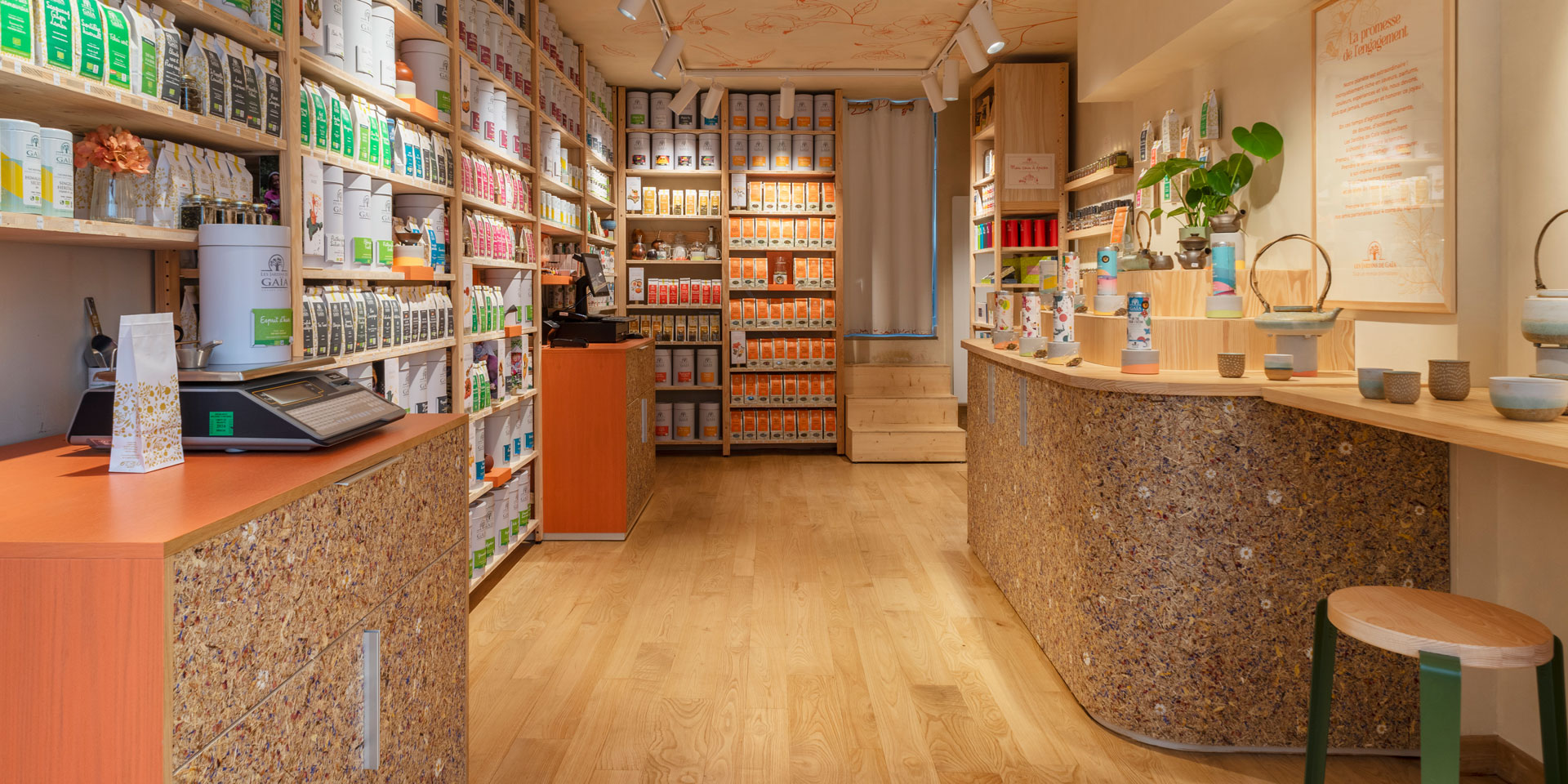 Die organischen Teeprodukte werden durch die gepressten, nachhaltigen Naturmaterialien und den zarten Duft von Heu und Kräutern perfekt in Szene gesetzt. Produkt und Raumdesign werden zu einer unverwechselbaren Einheit, die Werte wie Nachhaltigkeit, Natürlichkeit, Wohlbefinden und innere Ruhe vermittelt.