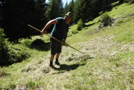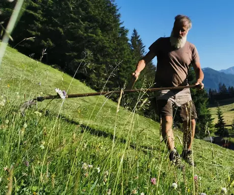 Im August ist die Zeit für die Heumahd in den Hochwiesen auf 1.700 m Seehöhe und auch höher. Die Arnikablüten sind bereits verwelkt, die Pflanzen haben ihren Samen verstreut. Jetzt geht die Arbeit erst richtig los!