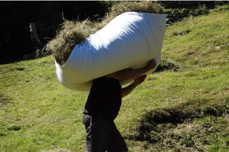 Die großen und auch sehr schweren Heupakete werden geschultert und vorsichtig über die Wiesen zum Pill getragen.