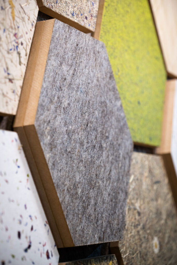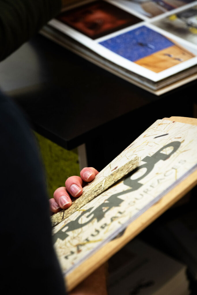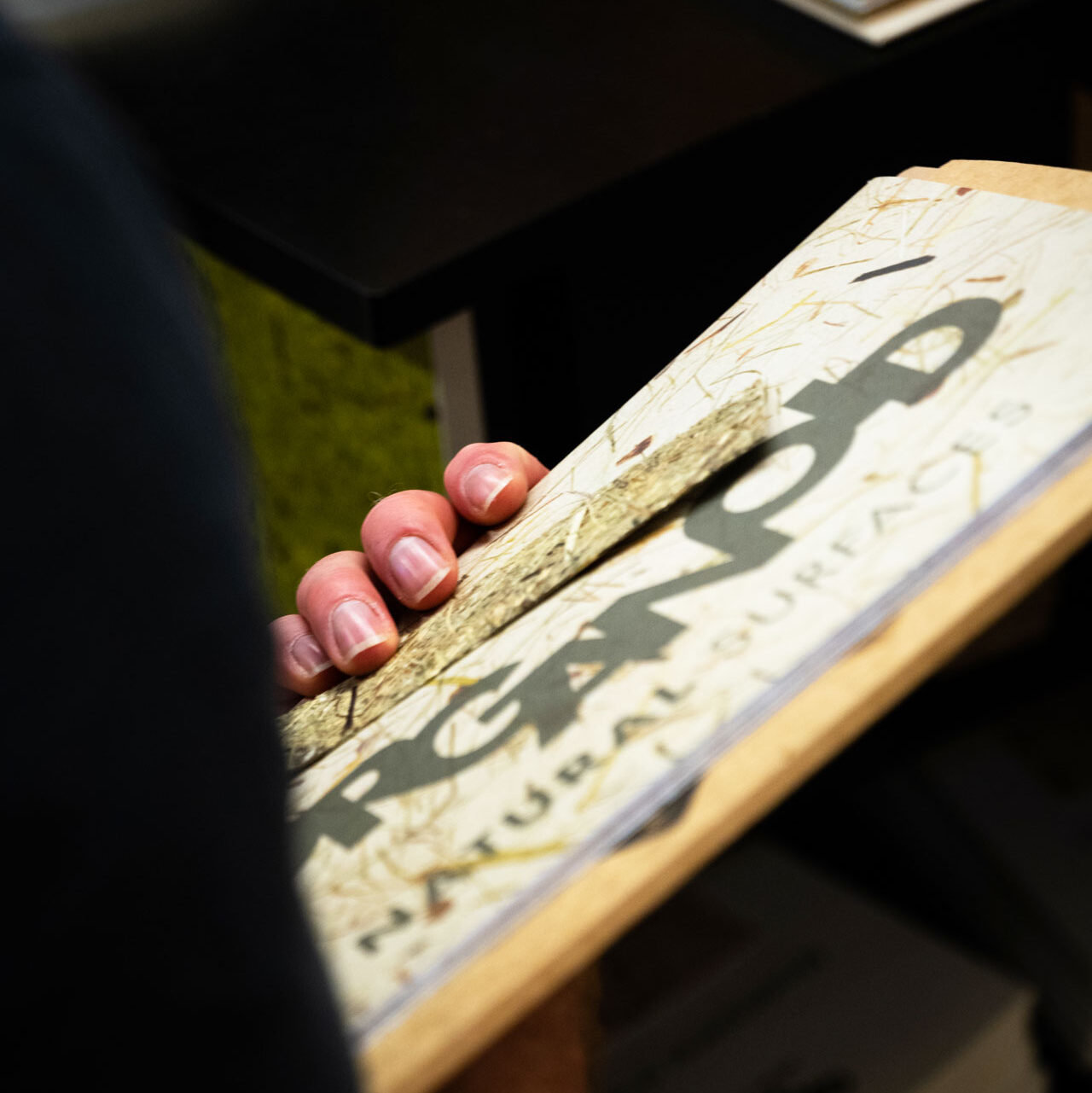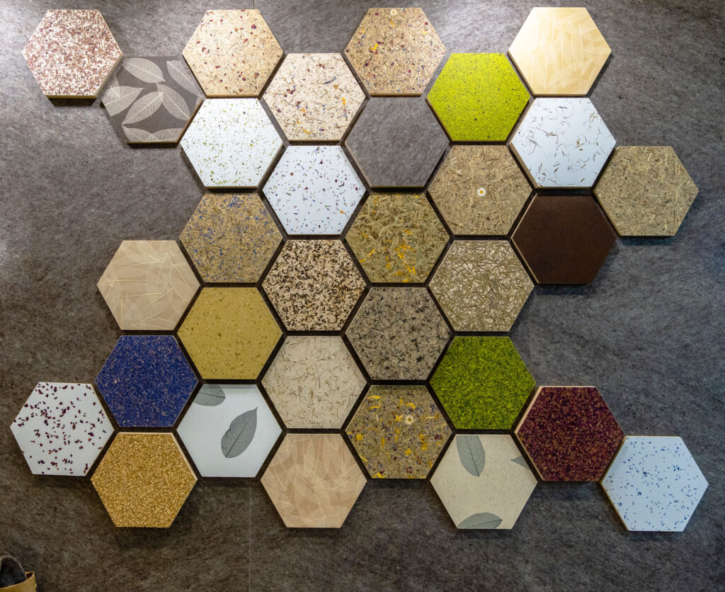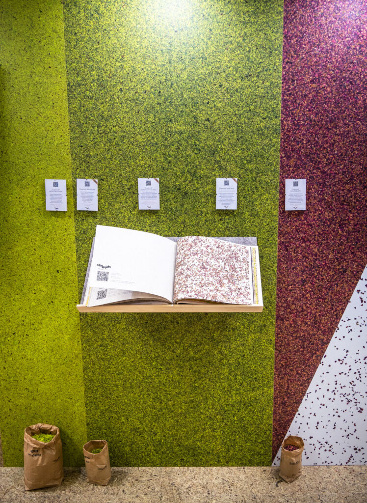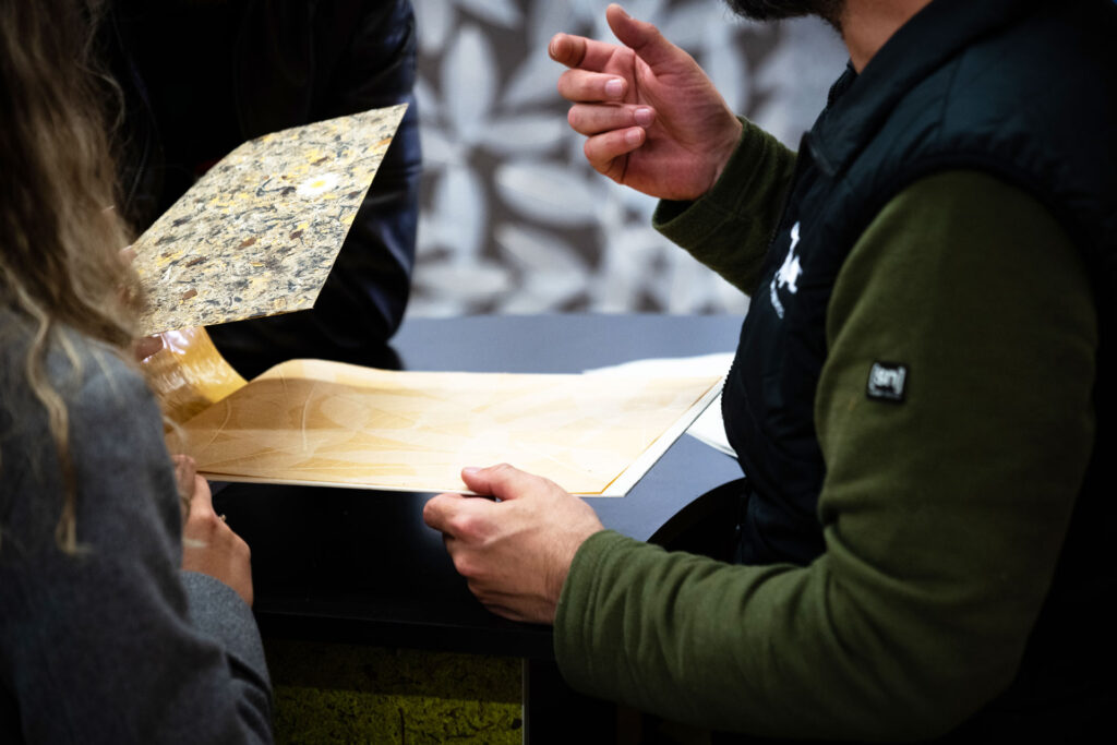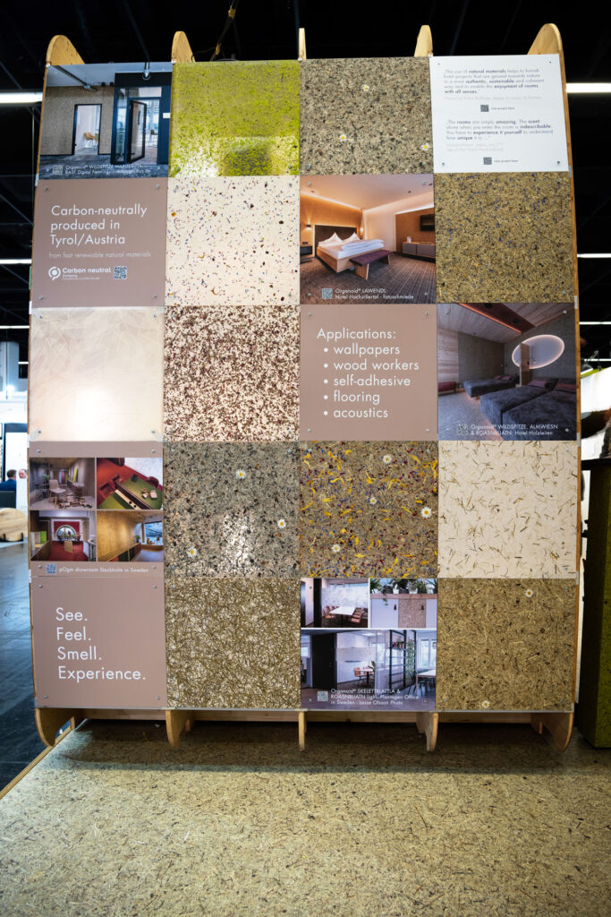Die neuen Organoid-Produkte sorgten auf der Interzum für Furore: Die Oberfläche MOUS MIX mit hell- und dunkelgrünem Moos, der LAWENDL und die WEINBLATTLA auf Flachsvlies, die ALMWIESN als neue light-Version und die SKELETTLBATTLA auf Goldpapier begeisterten Organoid-Fans und Interessierte gleichermaßen.