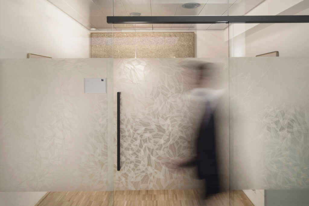 Die Lösung? Glas mit Sicht- und Durchlaufschutz. Die transluzenten natürlichen Oberflächen von Organoid ermöglichen eine ganz besondere Interpretation dieses Konzeptes. Natürliche, organische Materialien sorgen für Lichteffekte mit entspannender Wirkung und können auch leicht im Nachhinein angebracht werden.