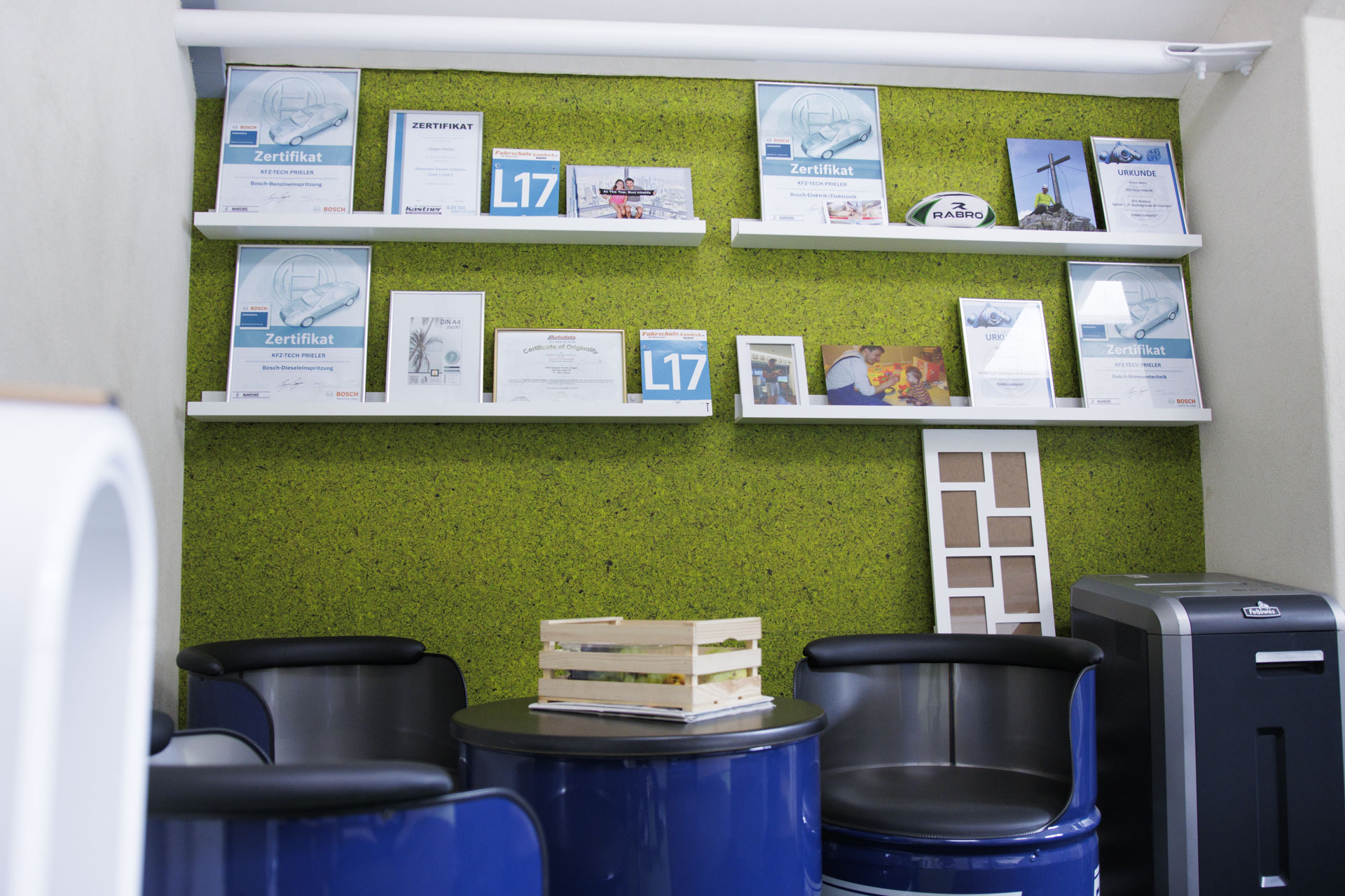 At the Jürgen Prieler car workshop, you can experience the forest in the interior with all your senses. This is made possible by the fresh green Organoid® natural surface MOOS MIX – an upcycled mixture of light and dark green moss. The moisture-regulating properties of the moss bring real freshness and well-being into the room. The smart material is the ideal addition for shelf displays and seating areas. The sustainable wallpaper is produced in a climate-neutral way just a few metres from the workshop.