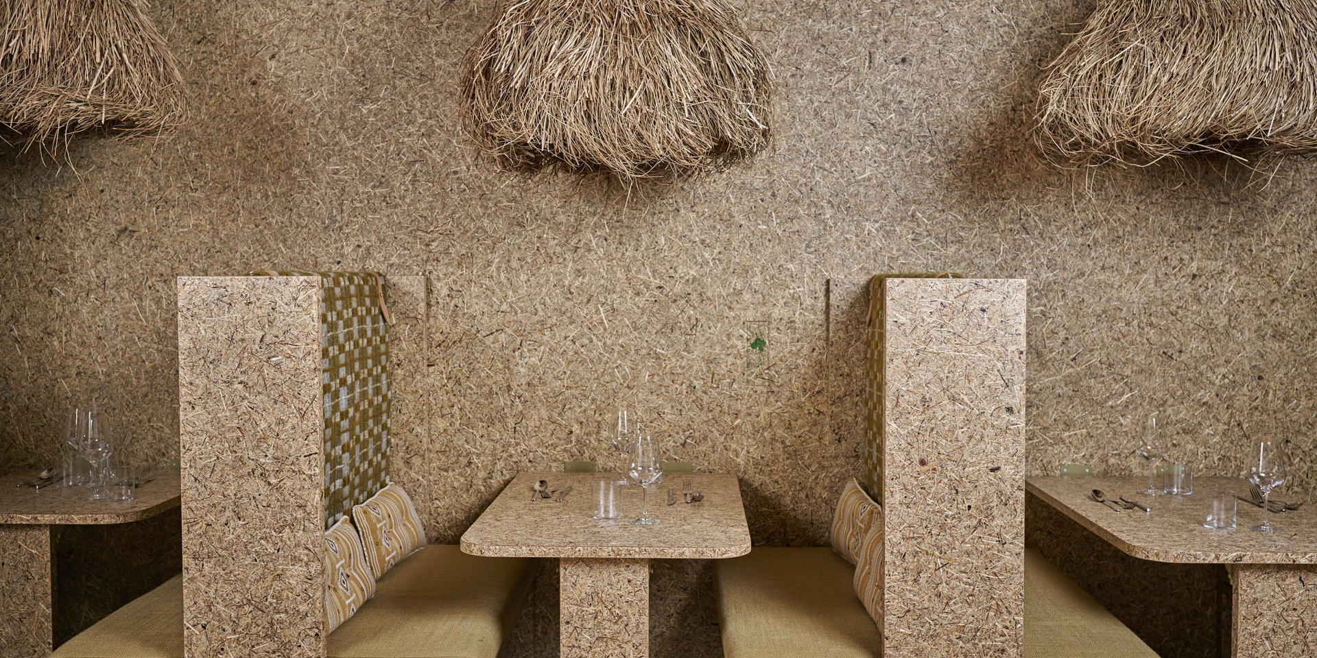 Doch die Schweizer Gastro-Innovatoren von aifach arosa gehen einen Schritt weiter: Sie haben die WILDSPITZE aus lokalem Arosa-Heu im All-Over-Look eingesetzt. Der Boden, die Wände, die Sitzgelegenheiten und Tische, die Fenster-Umrahmungen, sogar die Akustikdecke wurde mit dem Organoid-Material ausgestattet. Alles ist mit der Oberfläche aus natürlichem lokalen Bergheu gestaltet.