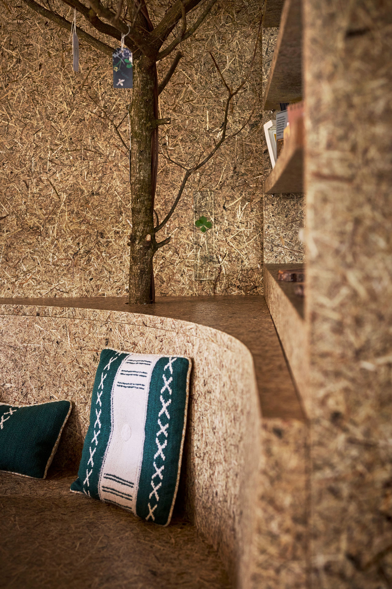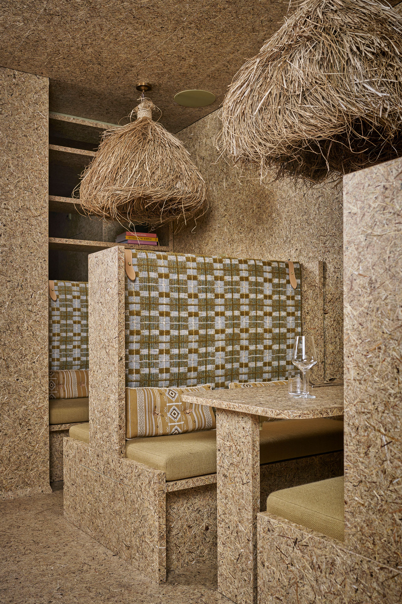 Doch die Schweizer Gastro-Innovatoren von aifach arosa gehen einen Schritt weiter: Sie haben die WILDSPITZE aus lokalem Arosa-Heu im All-Over-Look eingesetzt. Der Boden, die Wände, die Sitzgelegenheiten und Tische, die Fenster-Umrahmungen, sogar die Akustikdecke wurde mit dem Organoid-Material ausgestattet. Alles ist mit der Oberfläche aus natürlichem lokalen Bergheu gestaltet.