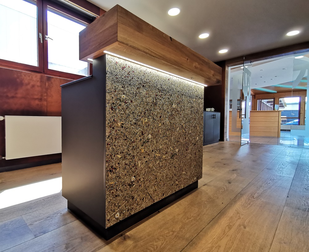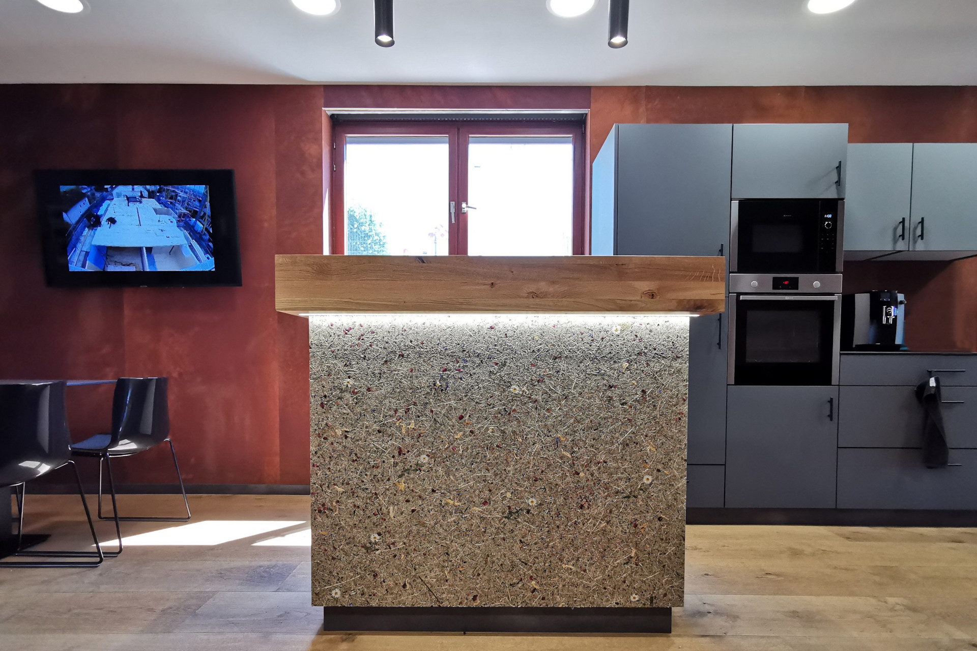 Die freistehende Theke mit der Organoid® Naturoberfläche ALMWIESN findet sich im Vesperraum und wirkt sowohl als Raumtrenner als auch als dekoratives Einzelstück.