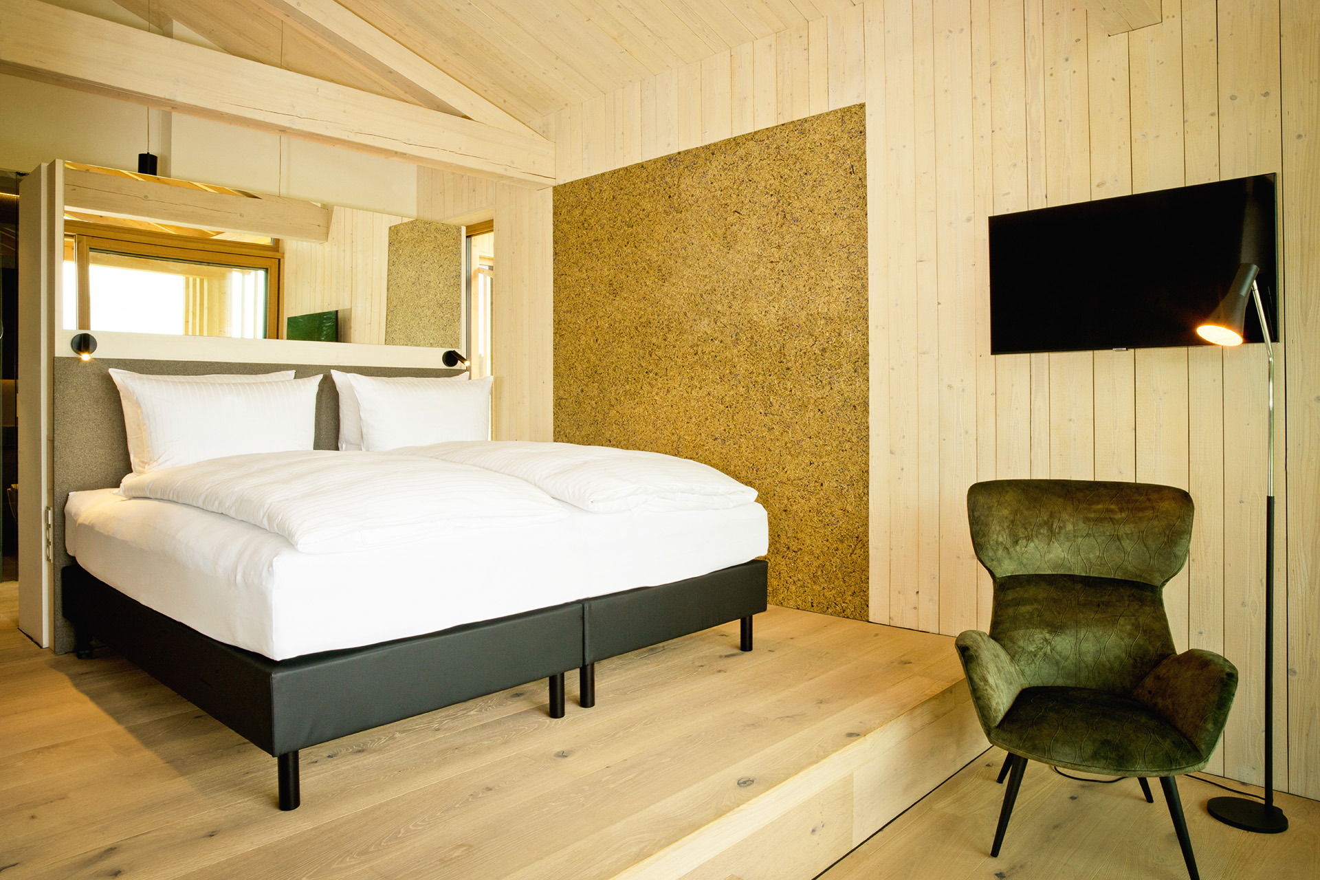Das natürliche und nachhaltige Material WILDSPITZE HIMMELBLAU passt perfekt in die Designphilosophie des Euler Woidhaisl. Die Wandtapete ziert den Schlaf- und Wohnbereich und verleiht dem Innenraum einen herrlich natürlichen Duft nach Almheu.