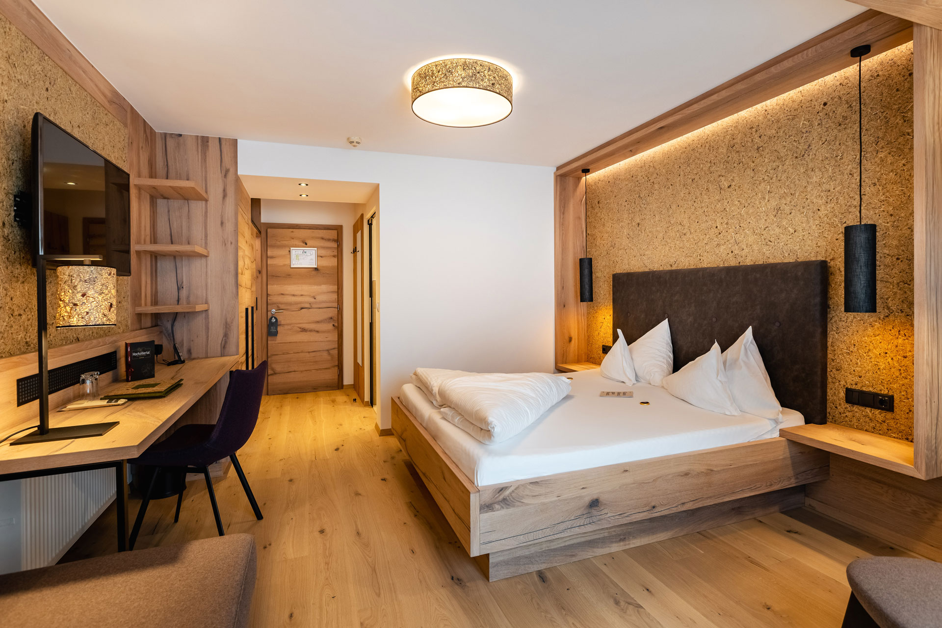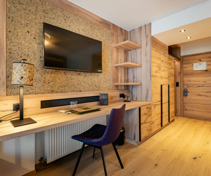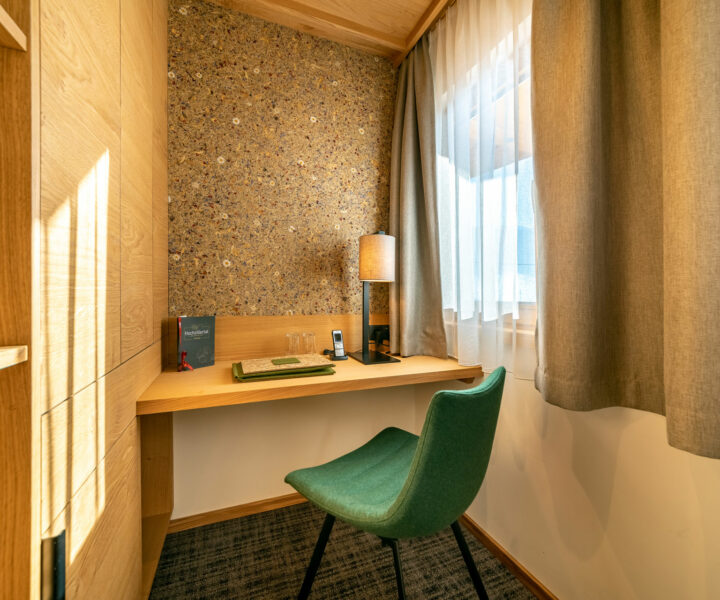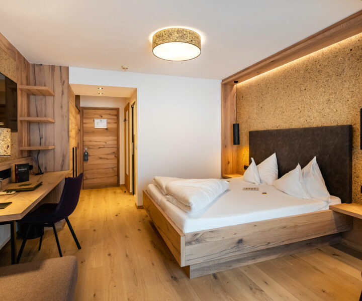 In den durchdachten und liebevoll eingerichteten Zimmern stehen Entspannung und Harmonie an erster Stelle. Die Dekore aus echtem regionalen Alpenheu aus Tirol sorgen in den Kräuterzimmern und -suiten Lavendel und Arnika für ein besonderes Raum- und Duftgefühl. Indirekte Beleuchtungen sowie Wand- und Deckenleuchten mit organoiden Naturmaterialien runden das Wohlfühlkonzept ab.