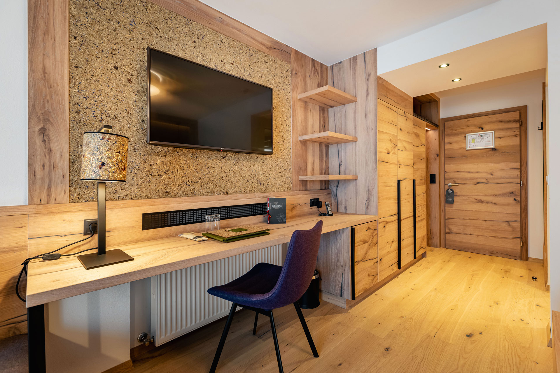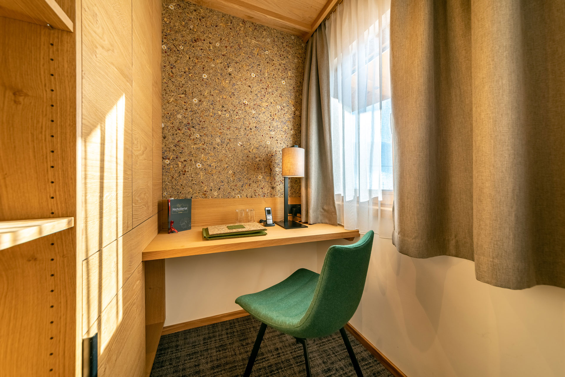 In der Rezeption findet sich ebenfalls die Naturoberfläche WILDSPITZE aus handgesenstem Almheu aus biologischer Landwirtschaft an den Wänden. So werden die Gäste gleich beim Betreten des Hotels mit einem zarten Kräuterduft begrüßt – ein echtes HOCHgefühl!