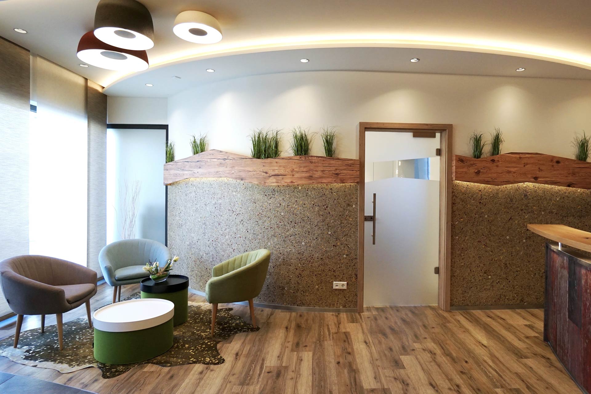 Die Organoid® Naturoberfläche ALMWIESN auf natürlichem Flachsvlies verleiht dem Empfangsbereich einen authentischen Look und verbreitet einen herrlichen Duft.