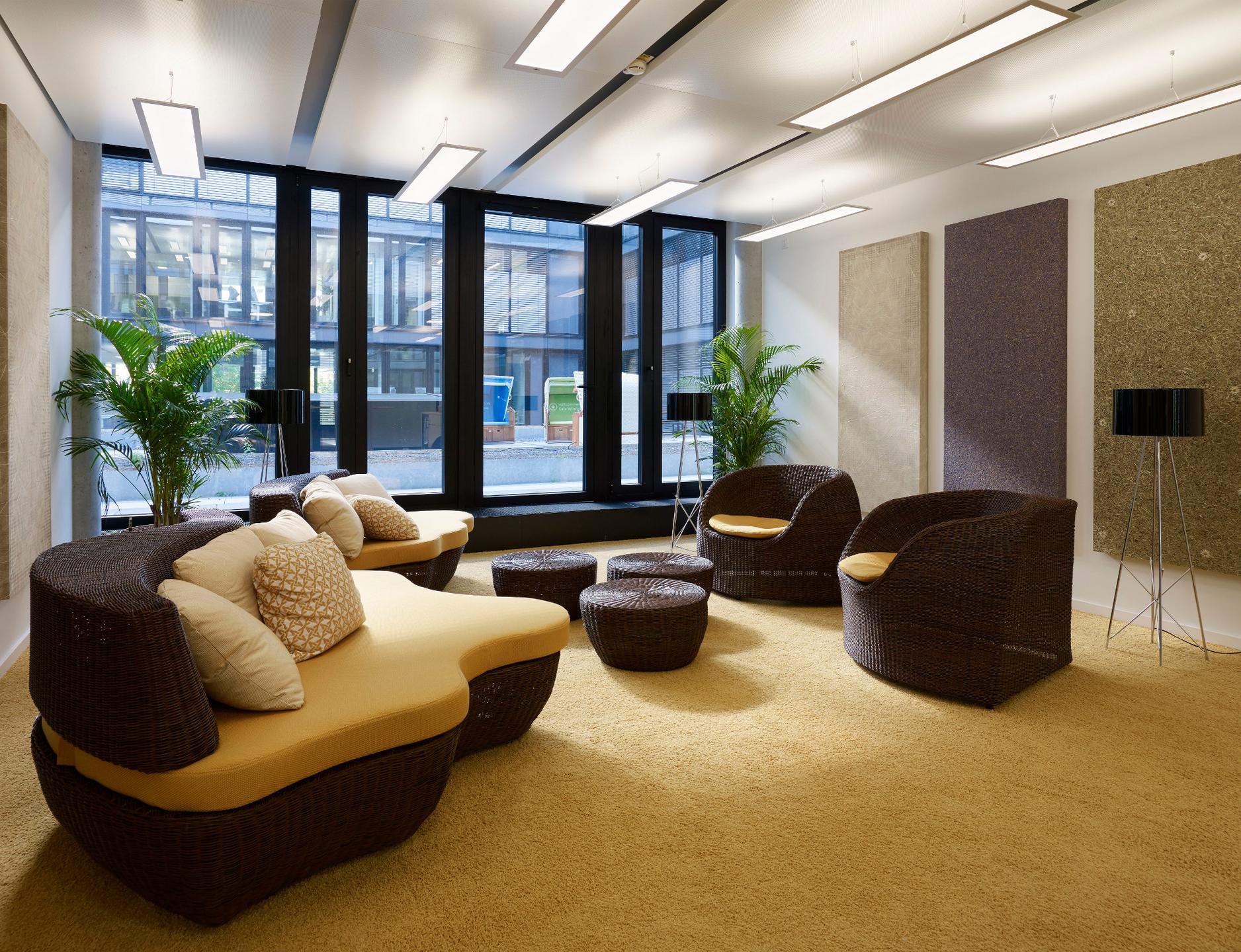 In der Firmenzentrale der Microsoft Deutschland GmbH können sich kreative Köpfe in einem neu gestalteten Arbeits-/Erholungsraum aufhalten. Das angenehme Raumklima wird sowohl durch die bodenständige, erdige Farbgestaltung, die bequemen Sitzmöbel als auch durch unsere akustisch wirksamen Bildabsorber an den Wänden geschaffen. So macht Arbeiten Spaß!
