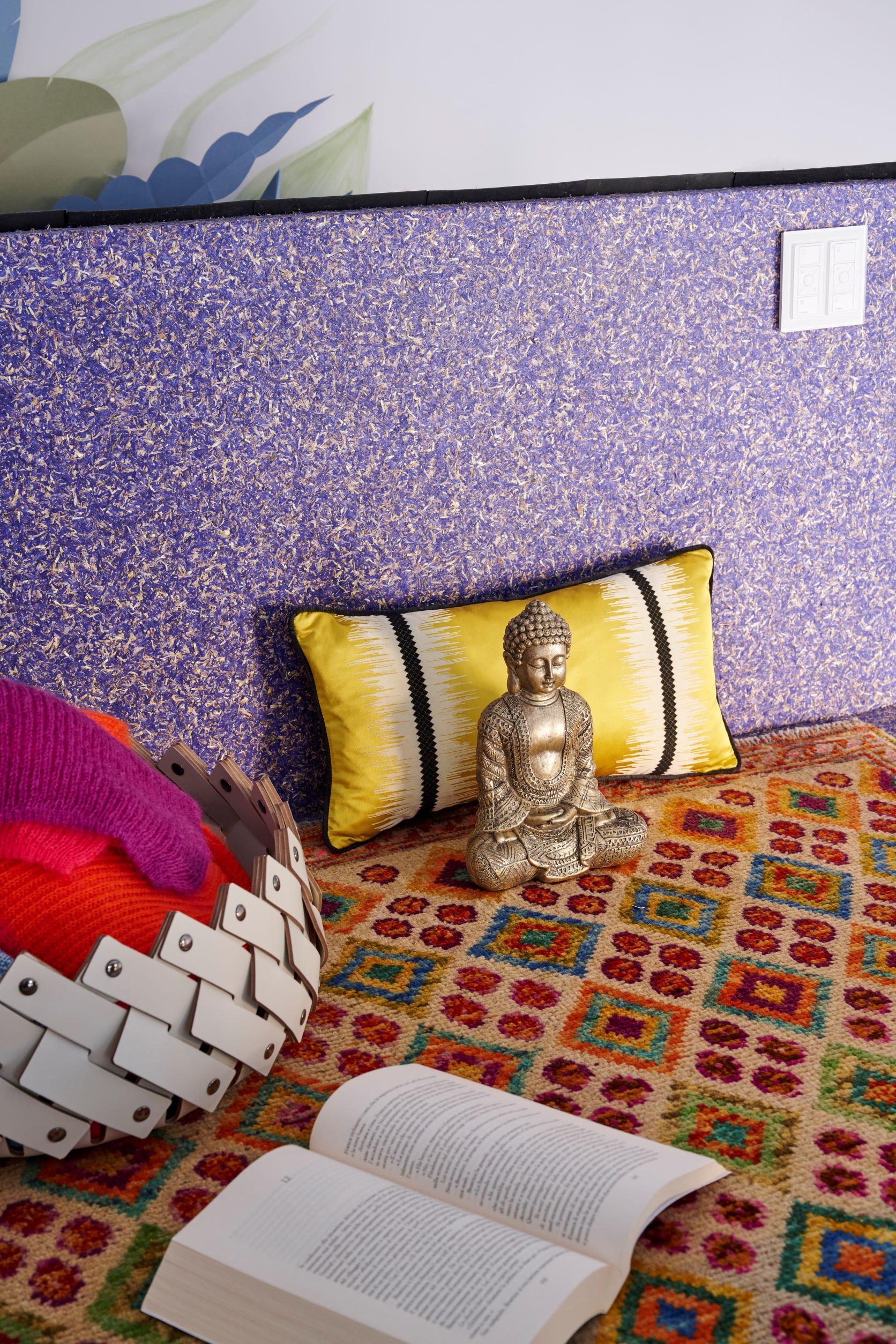 Das Zentrum des Raumes, ein funktionales Möbelstück, wurde mit harmonisierenden blauen Kornblumen veredelt. KORNBLUAMA BLAU auf natürlichem Flachsvlies ist ein echter Blickfang in dieser durchdachten Raumgestaltung.