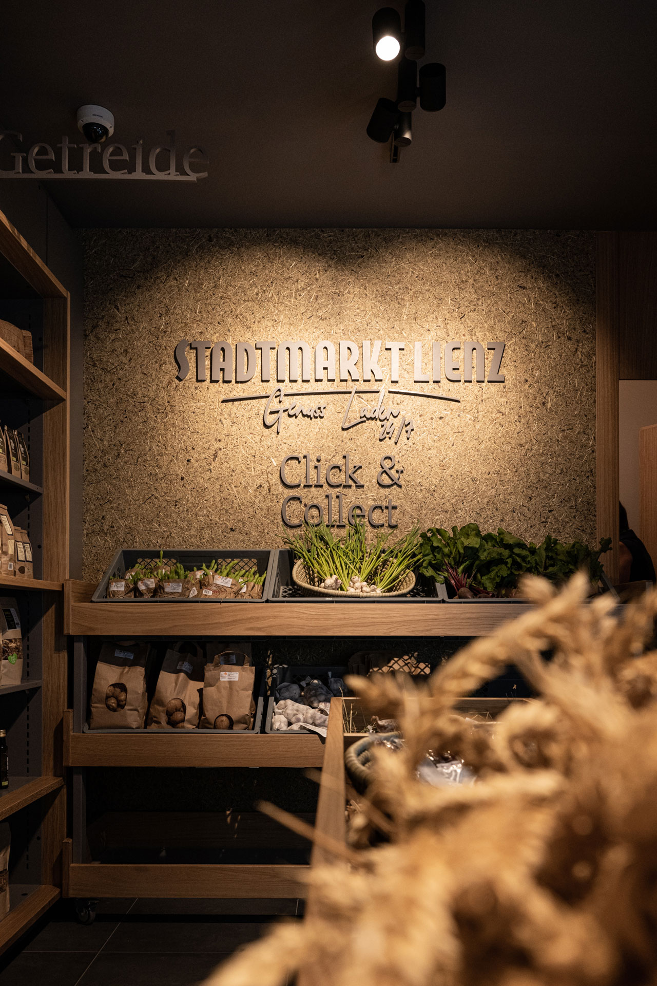 Das reine Heu unterstreicht die Naturnähe und Regionalität der Lebensmittel und sorgt mit seinem zarten Duft und der einzigartigen Optik für ein Einkaufserlebnis, das in Erinnerung bleibt. Die Wandoberfläche wird mithilfe der besonderen Beleuchtung zum idealen Untergrund für den Schriftzug des Marktes.