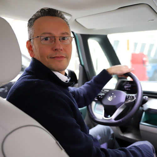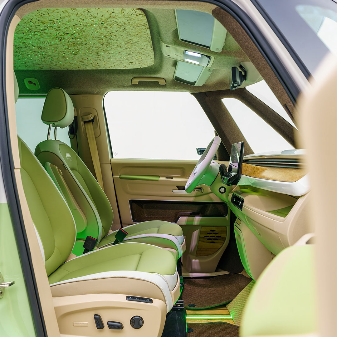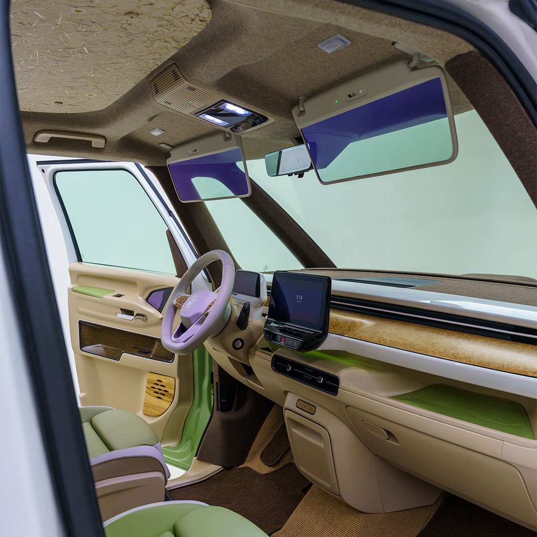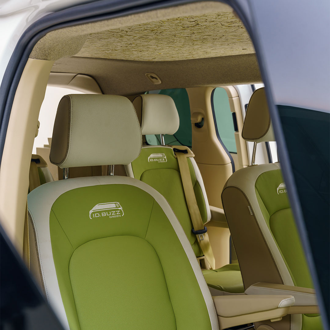 Die Auszubildenden haben den Dachhimmel des ID. Buzz neu gestaltet und dabei eine nachhaltige Organoid® Naturoberfläche auf natürlichem Flachsvlies verwendet. Das innovative und allergikerfreundliche Material wird aus duftendem Heu, Gräsern, Kräutern und Margeriten-Blüten klimaneutral in Tirol/Österreich hergestellt.