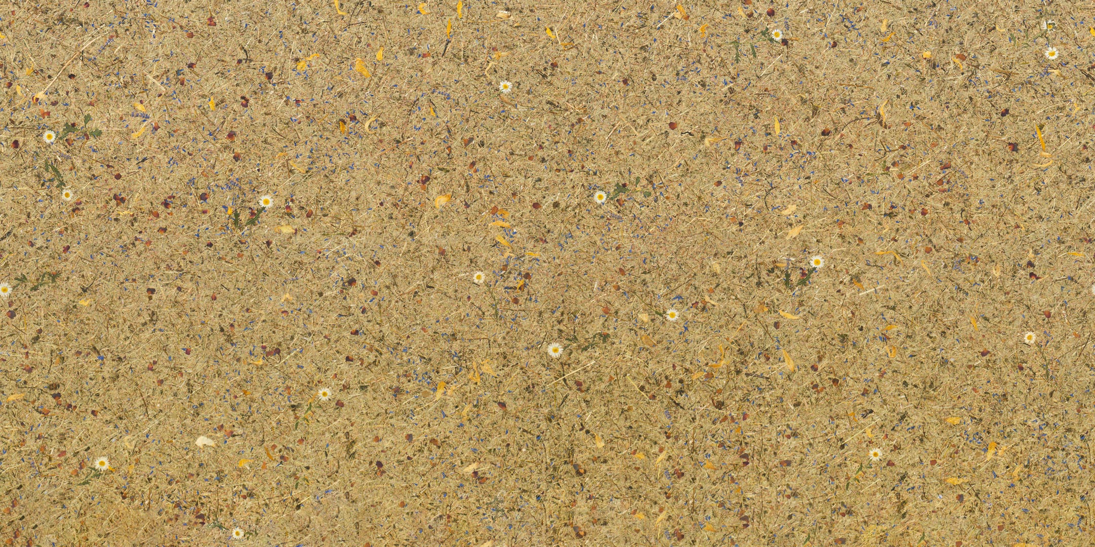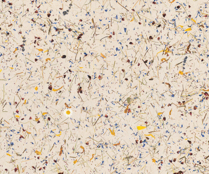 Bunte Blütenblätter und ca. 5 Margeriten pro m² auf regionalem, handgesenstem Almheu aus den Tiroler Alpen. In vollflächiger Auftragsstärke premium auf unterschiedlichen Trägermaterialien erhältlich – so wird jede Anwendung im Innenraum möglich.