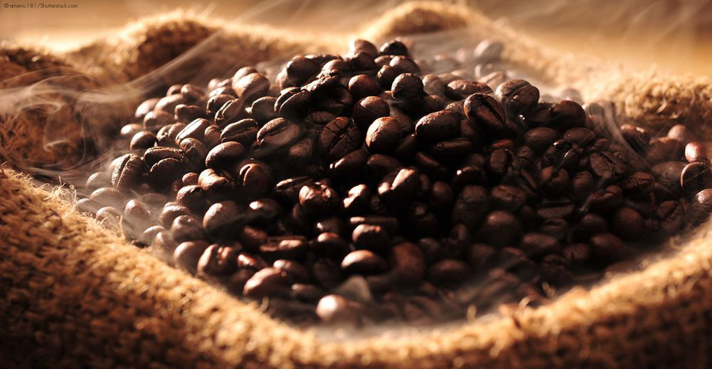 Duftendes Kaffeepulver in vollflächiger Auftragsstärke premium auf braunem Flexi.