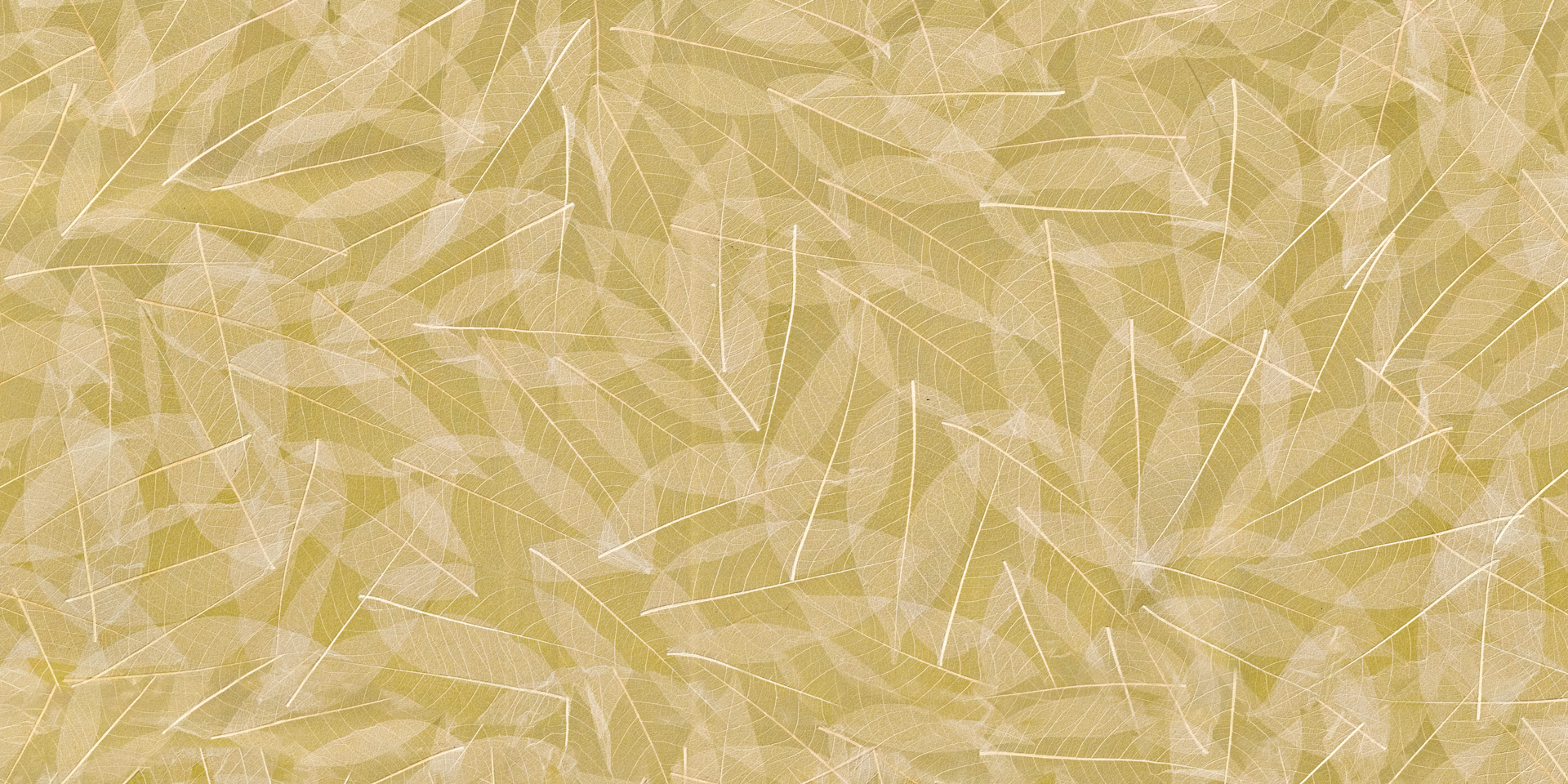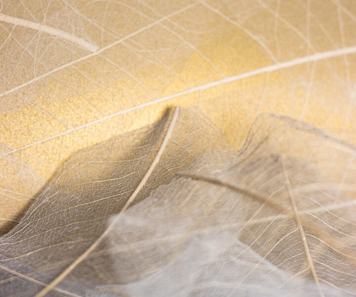 Zarte Skelettblätter in vollflächiger Auftragsstärke premium (ca. 200 Stück pro m²), handverlesen und einzeln aufgetragen auf goldenem Papier