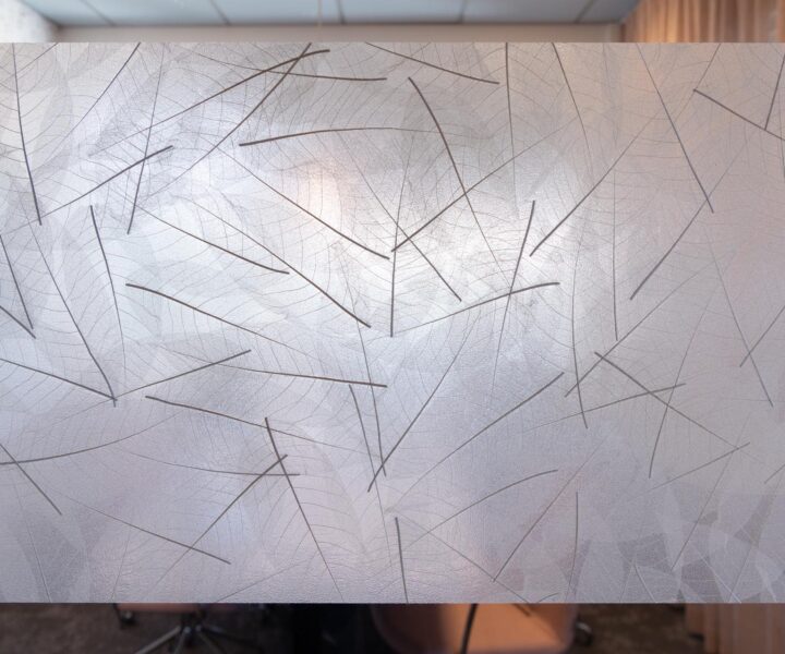 Die Natur ist der beste Designer – das zeigen die edlen, filigranen Blätter dieser Oberfläche. Echte skelettierte Riesenblätter vom Gummibaum verleihen deiner Raumgestaltung natürliche Eleganz und Leichtigkeit. Auf starker, transluzenter Selbstklebefolie für besondere Lichteffekte bei Anwendungen auf Glas und anderen Flächen.