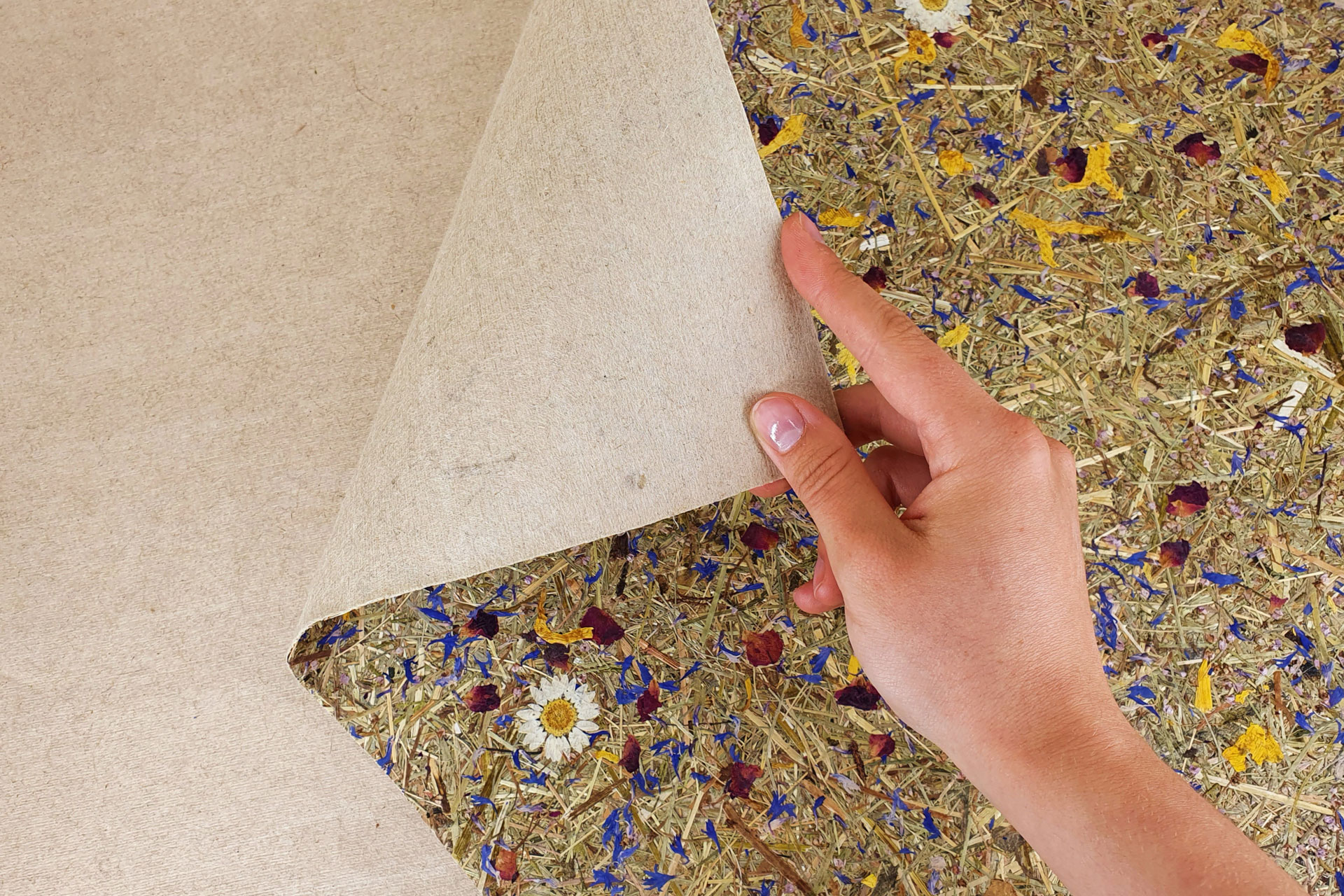 Bei uns im Organoid-Headquarter in Tirol veredeln wir das Flachsvlies mit echten unbehandelten Naturfasern wie Heu, bunten Blütenblättern und Moos. Durch den schonenden und klimaneutralen Produktionsprozess entsteht ein nachhaltiges Interior-Produkt, das alle natürlichen Eigenschaften hinsichtlich Haptik, Optik und Duft beibehält.